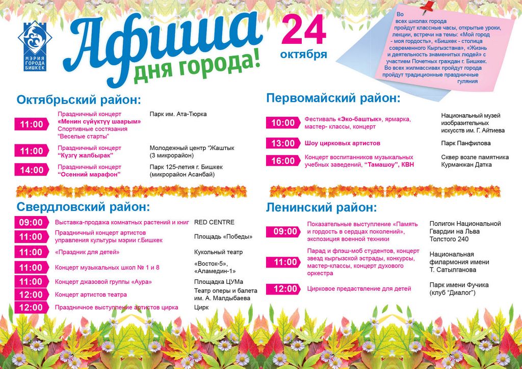 Отметим, что мэрия подготовила праздничную программу. Во всех районах пройдут концерты, выступления артистов театра и цирка, ярмарки, спортивные соревнования и мастер-классы. В школах проведут классные часы, открытые уроки, лекции и встречи на темы «Мой город – моя гордость», «Бишкек – столица современного Кыргызстана», «Жизнь и деятельность знаменитых людей».