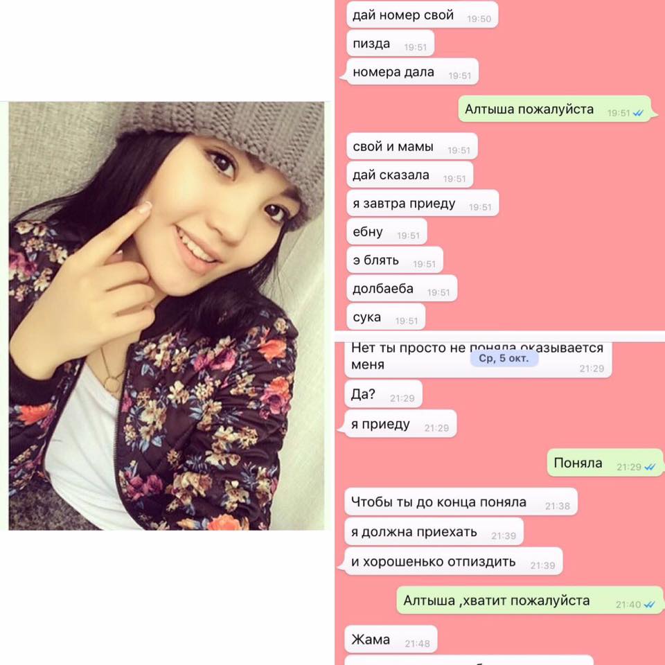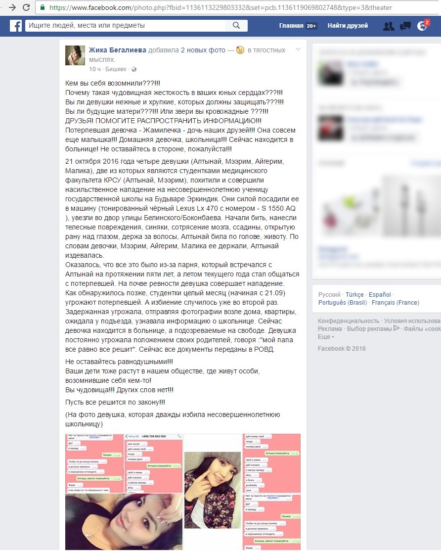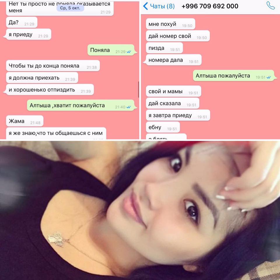 «21 октября 2016 года четыре девушки (Алтынай, Мээрим, Айгерим, Малика), две из которых являются студентками медицинского факультета КРСУ (Алтынай, Мээрим), похитили и совершили насильственное нападение на несовершеннолетнюю ученицу государственной школы на бульваре Эркиндик. Они силой посадили ее в машину - тонированный черный Lexus Lx 470 с госномером S 1550 AQ и увезли во двор улиц Белинского и Боконбаева. Алтынай била по голове, животу», - пишет приближенная к семье пострадавшей.