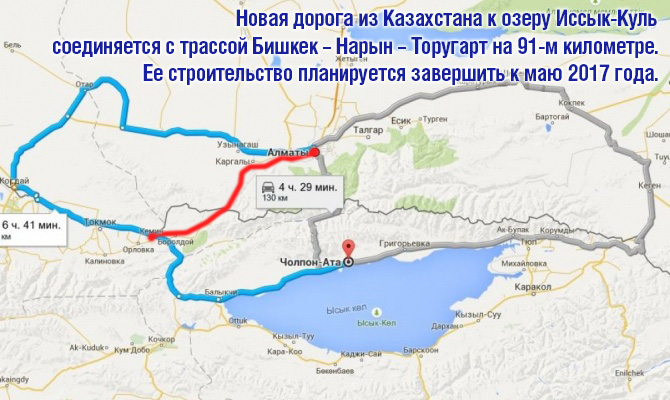 Протяженность новой дороги из Алматы (Казахстан) в Чолпон-Ату составит 280 километров. Такие данные приводятся в соглашении между правительствами Кыргызстана и Казахстана по проекту «Строительство автомобильной дороги Чолпон-Ата — Алматы».