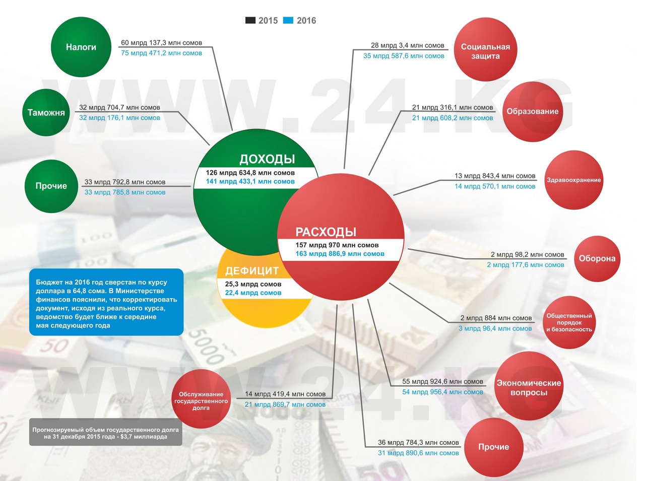 На 726,7 миллиона в 2016-м вырастут расходы на сферу здравоохранения. При этом бюджет Минздрава на 2016 год сократили на 777 миллионов сомов - до 3 миллиардов 724,7 миллиона. В бюджете предусмотрено 225 миллионов сомов на гемодиализ, дополнительно на противодиабетические препараты (инсулин) – 60 миллионов, на препараты от СПИДа – 20 миллионов, на Департамент лекарственного обеспечения и медицинской техники – 70 миллионов сомов.