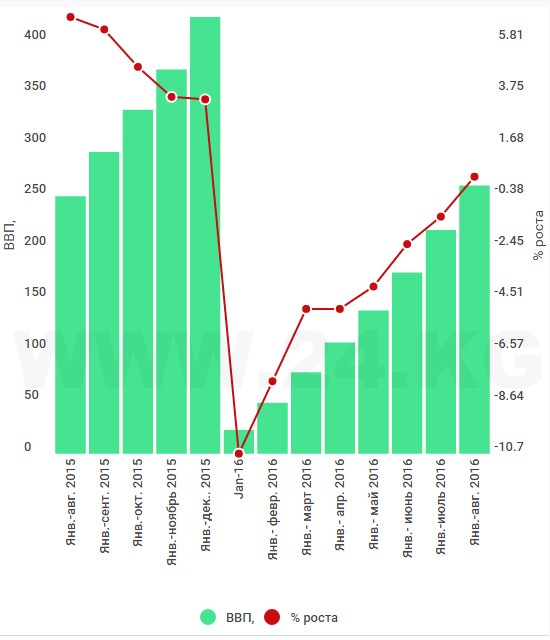 По итогам восьми месяцев 2016 года объем внутреннего валового продукта КР оценивается в 260,3 миллиарда сомов. По сравнению с аналогичным периодом 2015-го показатель вырос на 0,4 процента.