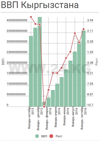 Сегодня Национальный статистический комитет представил предварительные итоги социально-экономического развития страны за 10 месяцев 2016 года. ВВП с начала года сложился в расмере 360 милилардов сомов. Это на 2,7 процента больше показателя 2015-го.