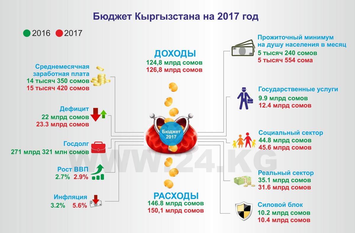 Законом утвержден бюджет-2017 с доходами в 126,8 миллиарда сомов и расходами в 150,1 миллиарда. Предельный размер дефицита госказны - 23,3 миллиарда сомов. Закон вступает в силу 1 января 2017 года.