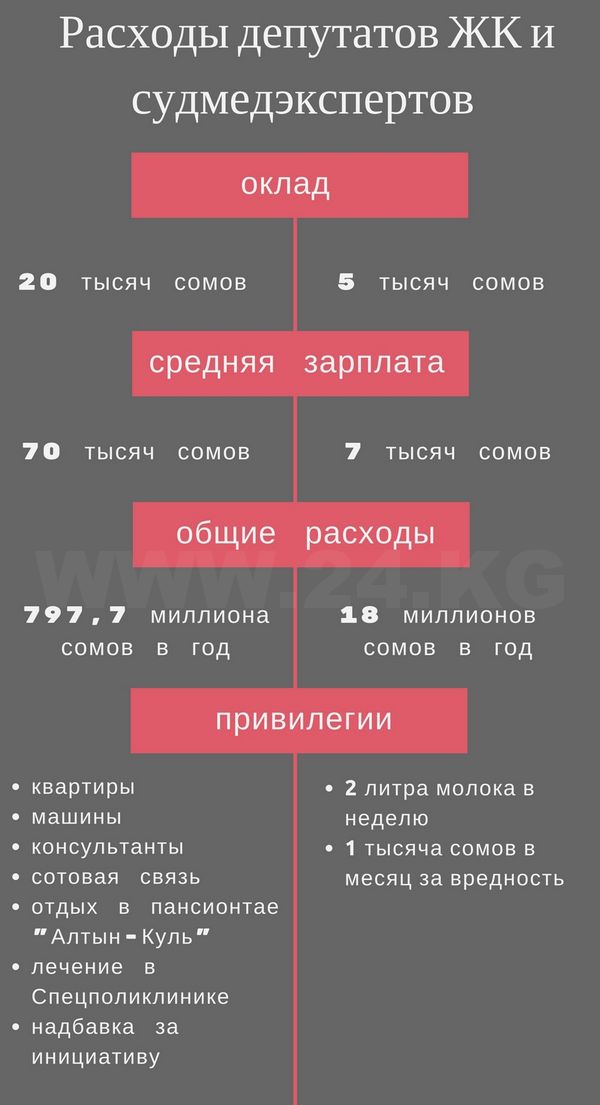 ИА «24.kg» предлагает читателям сравнить, какие льготы и привилегии есть у депутатов Жогорку Кенеша, а какие — у сотрудников Республиканского центра судмедэкспертизы.
