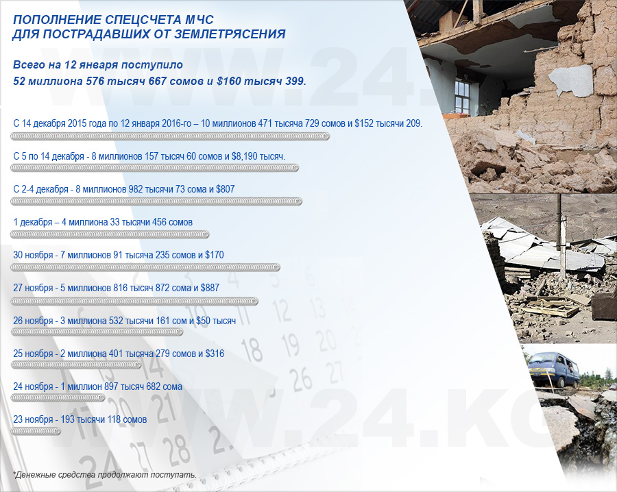 Спецсчет МЧС для пострадавших от землетрясения в Ошской области регулярно пополняется.