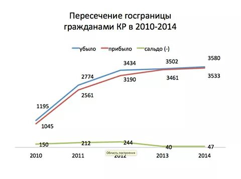 По ее данным, в 2010-2012 годах число выехавших за рубеж и не вернувшихся обратно составило свыше 150 тысяч и 212 тысяч. С 2013-го по 2014-й отток (отрицательное сальдо) сократился более чем в 4 раза. Это говорит о том, что миграционные настроения людей пошли на убыль, что связано с несколькими факторами. Первый - упрочение межнационального согласия и улучшение показателей безопасности граждан в стране. Второй - ухудшение экономических показателей в России и Казахстане, основных странах трудоустройства граждан КР. В результате выезжать за рубеж на заработки стало менее выгодно.