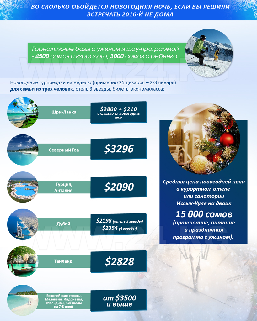 ИА «24.kg» узнало, во сколько обойдется новогодняя ночь, если вы решили встречать 2016-й не дома. Посмотреть, сколько стоит новогоднее украшение дома, можно здесь.