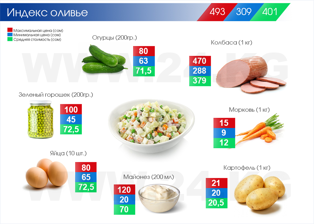 Исходя из такого - весьма приблизительного - рецепта выяснилось, что оливье вполне можно считать одним из недорогих новогодних блюд. На приготовление бюджетного варианта придется потратить 309 сомов. А вот покупка самых дорогих ингредиентов увеличит его стоимость на 184 сома - до 493 сомов. Средняя стоимость салата оценивается в 401 сом. Впрочем, можно особо не заморачиваться и купить уже готовый за 300 сомов.