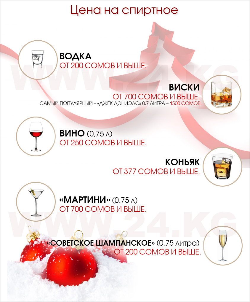 А из неполезного, но используемого в Новый год в больших объемах - спиртные напитки. Здесь разлет цен на них просто огромный, поэтому мы взяли нечто среднее и наиболее популярное в Бишкеке.