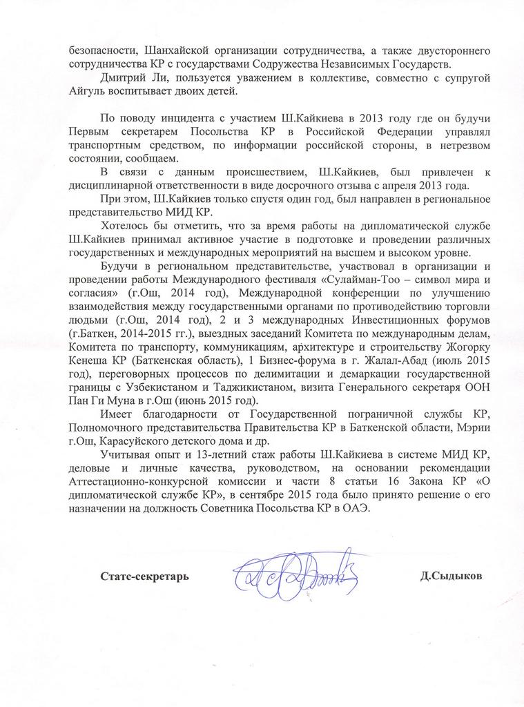 «Учитывая опыт и 13-летний стаж работы, деловые и личные качества, руководством на основании рекомендации аттестационно-конкурсной комиссии и части 8 статьи 16 Закона КР «О дипломатической службе» в сентябре 2015 года принято решение о его назначении на должность советника посольства КР в ОАЭ», - говорится в официальном письме МИДа на запрос редакции.