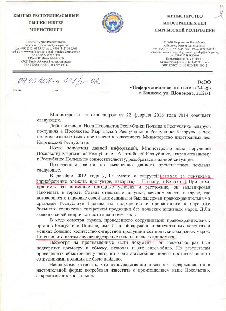 Я прошу пардону, конечно, но какое это имеет отношение к вопросам, адресованным редакцией министерству? Напомним, в ИА «24.kg» попала нота Посольства Республики Польша в Беларуси в Посольство КР в Беларуси о задержании в 2012 году в городе Белостоке (Польша) двух кыргызстанских дипломатов - Дмитрия Ли, 1976 года рождения, имеющего дипломатический паспорт КР AD000381, выданный 8 октября 2012 года и действительный до 8 октября 2017-го, и Айгуль Джеенкуловой, 1978 года рождения, имеющей дипломатический паспорт КР AD002780, выданный 4 октября 2011-го и действительный до 4 октября 2016 года. Согласно документу, вышеуказанные лица на легковом автомобиле марки AUDI (регистрационный номер CD1809-7) доставили в гараж жилого дома в городе Белостоке около тысячи блоков сигарет стоимостью приблизительно 150 тысяч злотых без польских акцизных знаков. Граждан поместили в камеру предварительного заключения в отделе полиции Белостока на улице Бема, 4. Статс-секретарь Данияр Сыдыков информацию о задержании в Белостоке Дмитрия Ли и его супруги Айгуль подтвердил, сообщив, что МИД поручил посольству КР в Австрийской Республике, аккредитованному в Польше по совместительству, разобраться в ситуации.