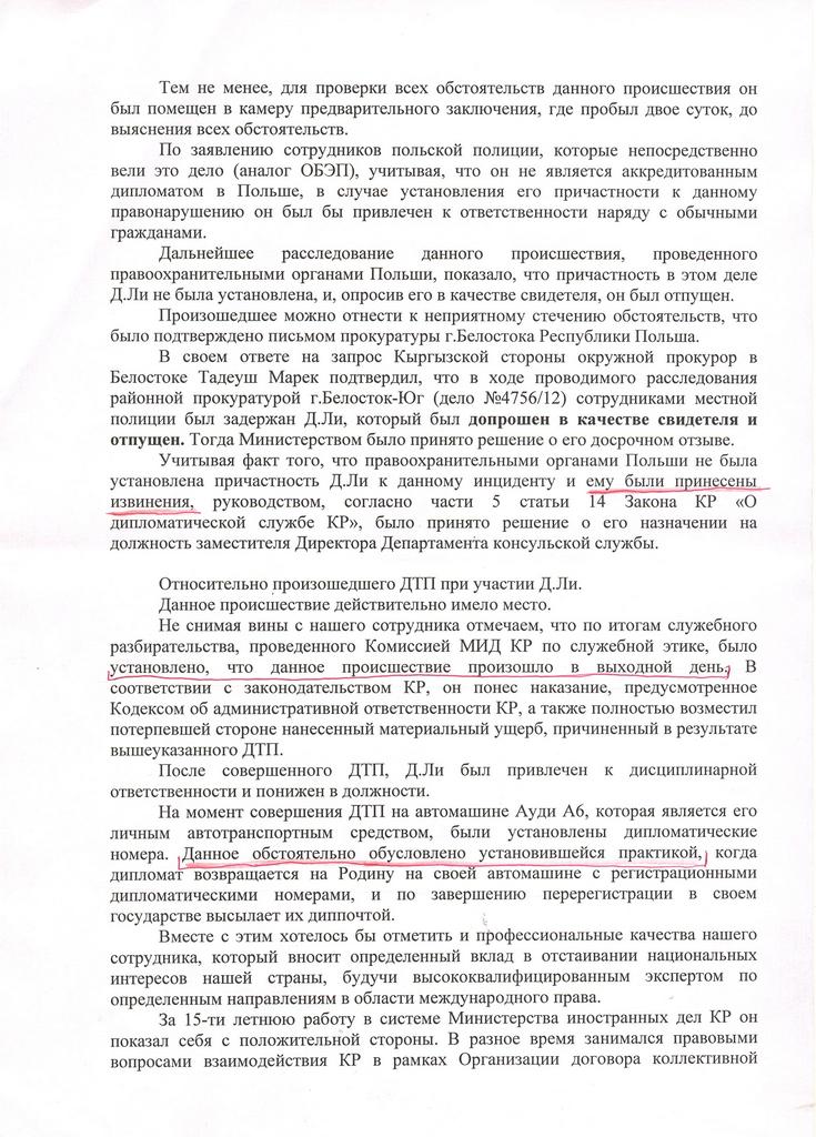 «Дальнейшее расследование, проведенное правоохранительными органами Польши, показало, что причастность Дмитрия Ли к этому делу не была установлена, и опросив его в качестве свидетеля, дипломата отпустили. По итогам проведенного расследования данного происшествия, показавшего непричастность Дмитрия Ли к этому делу, правоохранительными органами Польши принесены извинения за произошедшее», - говорится в документе внешнеполитического ведомства. По данным министерства, руководство согласно части 5 статьи 14 Закона КР «О дипломатической службе» приняло решение о его назначении на должность замдиректора департамента консульской службы. Хорошее решение.