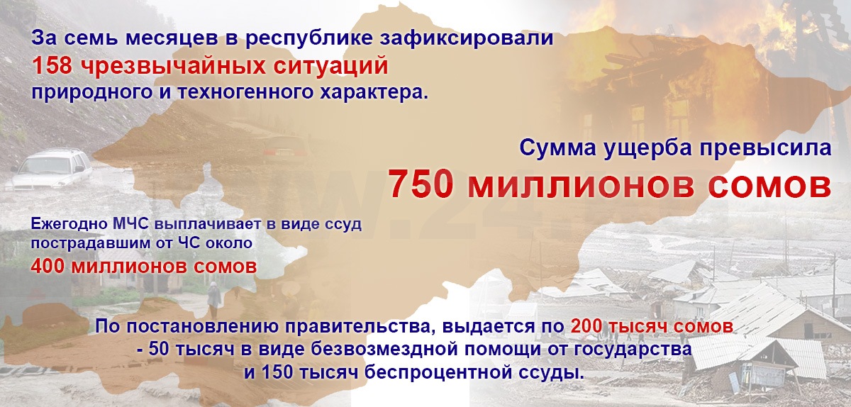 В конце июля селевые потоки прошли в городе Сулюкте Баткенской области. Ущерб жителей составил более 15 миллионов сомов. Однако из 54 пострадавших только одна владелица, своевременно застраховавшая жилье, получила страховое возмещение в 96,8 тысячи сомов.