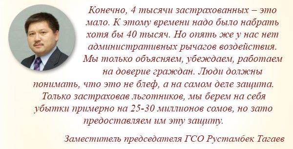 По данным на 15 августа, лишь 4 тысячи 290 человек приобрели страховые полисы. Большая часть из них (около 3 тысяч) проживает в сельской местности, для которой установлен ежегодный тариф в 600 сомов. Почти 1,2 тысячи застрахованных живут в городах, для них тариф в два раза больше. Не остаются в стороне и льготники, для которых предусмотрены полные или частичные скидки. Страховая премия на отчетную дату составила 3 миллиона 156 тысяч сомов, при этом ответственность Государственной страховой организации (ГСО) составляет 2 миллиарда 778 миллионов.