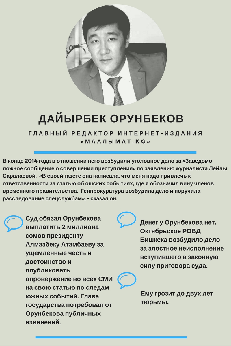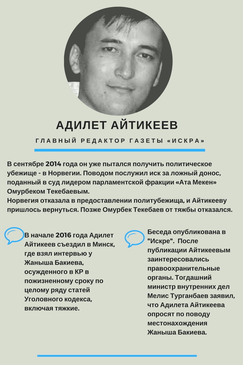 По словам Адилета Айтикеева, ситуация вокруг прописанных в Конституции гарантий свободы слова и выражения своего мнения обострилась, когда были арестованы оппозиционеры. Первые вестники давления на свободу граждан появились, когда правоохранительные органы начали преследование другого журналиста - Дайырбека Орунбекова.