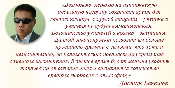 Депутат парламента Дастан Бекешев предлагает перевести школы на пятидневную учебную неделю. Поправки в Закон «Об образовании» вынесены на общественное обсуждение.