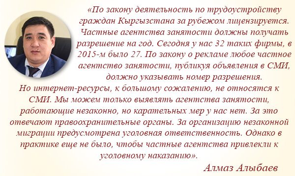 Доверия к агентству после личной беседы почему-то не добавилось. На сайте информационно-консультационного центра (ИКЦ) при Государственной службе миграции опубликован список частных агентств занятости, имеющих разрешение на право осуществления деятельности по трудоустройству граждан Кыргызстана за рубежом. Данной компании в списке нет, а значит, и разрешения они не имеют. И вряд ли будут нести какую-то ответственность за наших кыргызстанок, попавших в плохую ситуацию или оставшихся на улице в чужой стране.