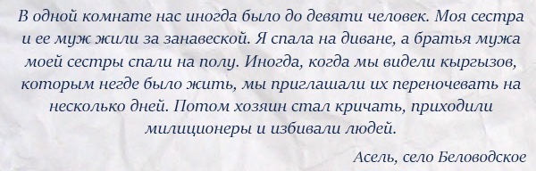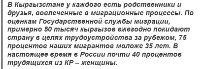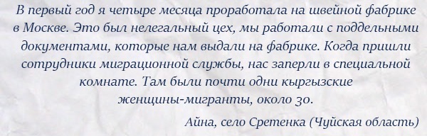 Согласно данным, приведенным в Едином докладе по миграции, в 2015 году 60 процентов кыргызских мигрантов в РФ жили нелегально. Ни одна из опрошенных женщин не подписала контракт с работодателем. Некоторые упомянули «устное соглашение».