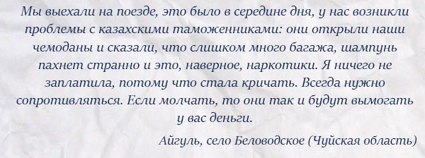 «Кыргызских мигрантов, не знающих, что они внесены в черные списки, и приезжающих из КР в РФ поездом, могут остановить на российско-казахской границе. При этом они могут не иметь денег для покупки обратного билета. Подобная ситуация довольно распространена, поскольку у многих мигрантов есть средства только на то, чтобы добраться до места, где они надеются получить работу. Положение мигрантов, которых останавливают на казахстанской границе, становится особо уязвимым, им легко стать жертвой эксплуатации и принудительного труда», - констатируют правозащитники.