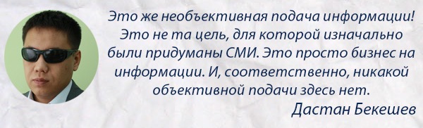 Сам Дастан Бекешев уверяет, что инициатива возникла не по этой причине, и привел в пример выборы ректора Кыргызской государственной медицинской академии (КГМА). «Человек еще не успел приступить к работе, как на следующий же буквально день начали на пресс-конференции обливать ее грязью. А почему другой стороне не дают точно такую же площадку, чтобы высказаться? Это уже никому не интересно, оправдательная концепция не интересна. Для этого журналисты уже говорят: «Деньги давай». И таких случаев очень много. Поэтому в законе нужно прописать: если ты кого-то в негативном свете выставляешь, то другой стороне тоже должен дать соответствующую площадку высказаться», - сказал он ИА «24.kg».