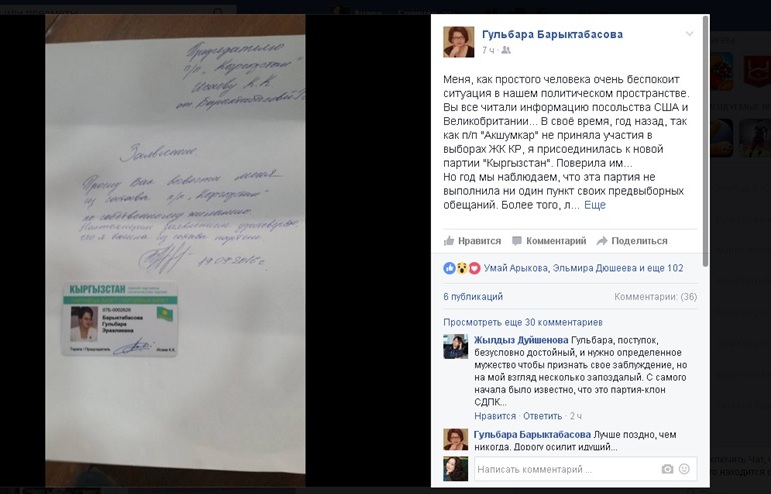 «Год мы наблюдаем, что эта партия не выполнила ни один из пунктов своих предвыборных обещаний. Смотрю, совсем заигрались господа депутаты, до них не достучаться. Республика стоит перед хаосом, каждый день нас потрясают волной грязи компроматов. В этой ситуации я рада, что ничего меня не связывает с политпартией «Кыргызстан», только одно разочарование», - написала Гульбара Барыктабасова.