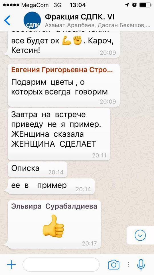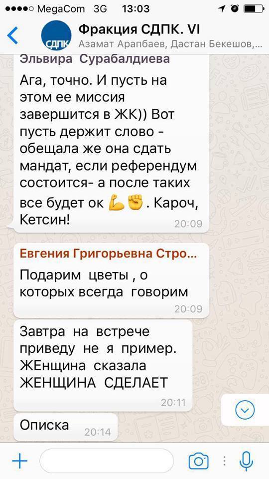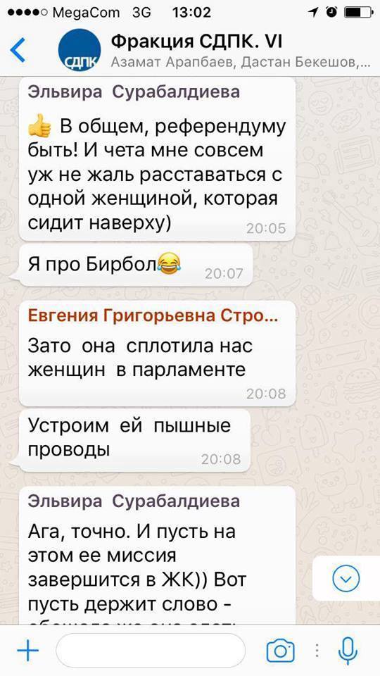 Сегодня в Интернет выложили переписку двух депутатов парламента от фракции СДПК - Эльвиры Сурабалдиевой и Евгении Строковой, в которой они «выпроваживают» свою коллегу - члена фракции «Бир Бол» Чолпон Джакупову.
