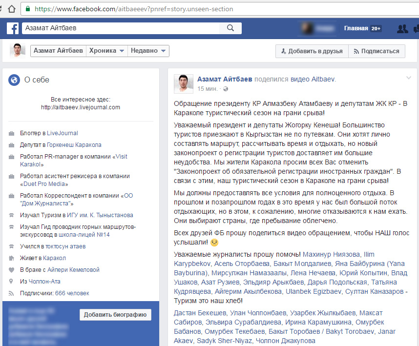 Сегодня жители Каракола сняли видеообращение к президенту Алмазбеку Атамбаеву и депутатам Жогорку Кенеша с просьбой отменить поправки в закон о миграции. Видео опубликовал на своей странице в Facebook депутат городского кенеша Каракола Азамат Айтбаев.