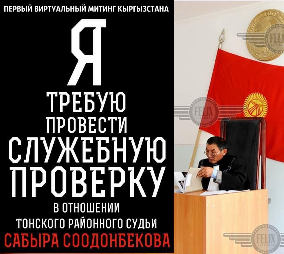 Кыргызстанцы проводят интернет-митинг с требованием провести проверку в отношении судьи Тонского района Сабыра Соодонбекова. Об этом на своей странице в Facebook написал блогер Кайрат Бекмамбетов.