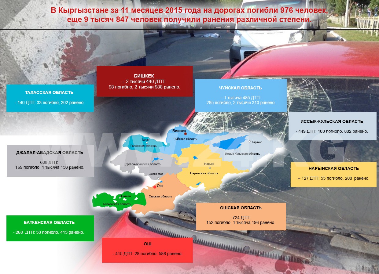 Больше всего погибших – 285 - зарегистрировано в Чуйской области, меньше всего аварий с летальным исходом – 28 - произошло в Оше.