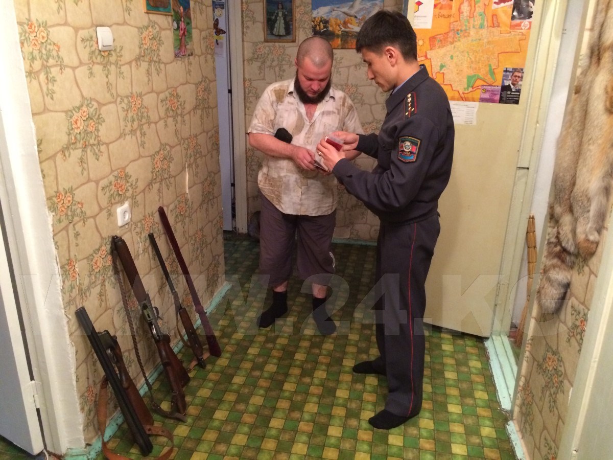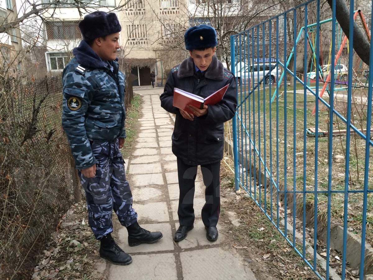 Корреспондент ИА «24.kg» принял участие в рейде. Участковый уполномоченный, капитан милиции ГОМ-4 УВД Октябрьского района Руслан Маллаев и сотрудник полка специального назначения МВД начали проверку на своей территории. Участок Руслана - часть микрорайона «Асанбай», где проживает около четырех тысяч человек. За три года работы он стал здесь своим. Здороваются многие: и дети, и взрослые. Он открывает журнал, в котором зарегистрировано 26 человек, имеющих разрешение на хранение оружия и охотничьи билеты.