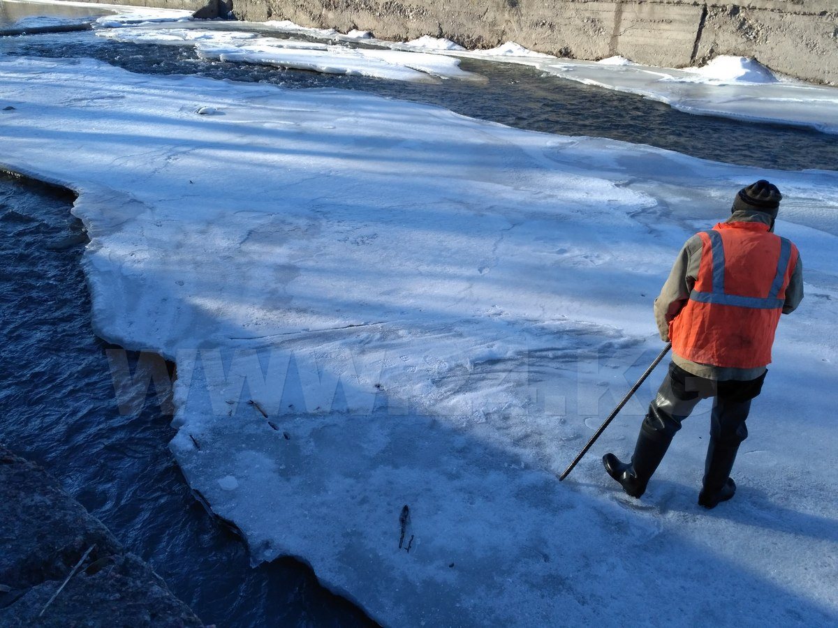 Вторым участком, где ледяная вода грозилась выйти из берегов, был район возле популярного ранее магазина «Космос», ниже улицы Ахунбаева. Там преградой водному потоку стали шлюзы предприятия «Горводремхоз». Шлюзы и сегодня стоят, но чтобы предотвратить заторы, работники предприятия разбивают лед на реке.