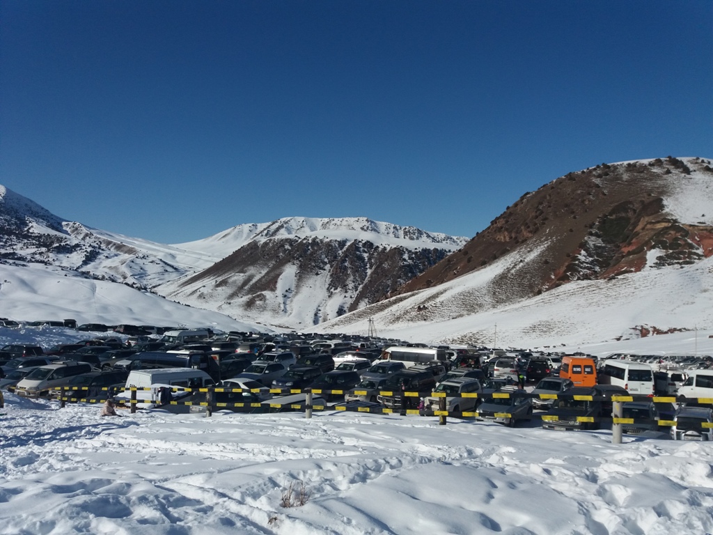 К половине десятого утра почти все стоянки были забиты. Очередь к кассе и на канатную дорогу растянулась на несколько сотен метров. Дальше обстановка только ухудшалась. Машины приходилось парковать прямо на дороге, за несколько километров от базы. В очереди на «Белый» подъемник приходилось ждать минимум по 30-40 минут.