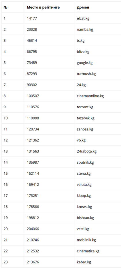 Список и соответствующее место кыргызстанского веб-сайта в международном рейтинге