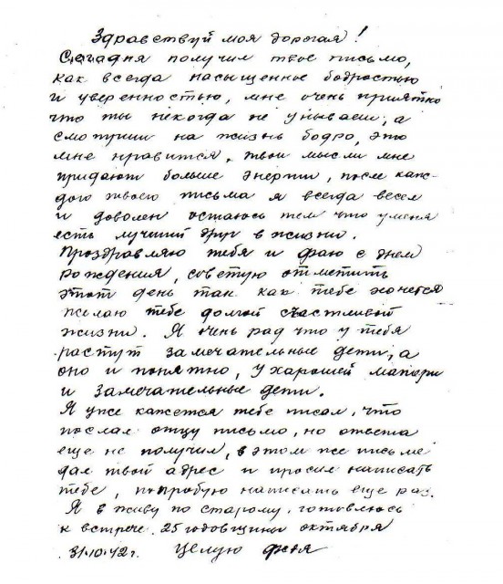 «…Твое письмо является для меня большим счастьем, но только нужно тебе заметить, что ты очень мало пишешь, ты не стесняйся, пиши как умеешь, на ошибки не обращая внимания, я твои письма понимаю очень хорошо, даже могу сказать, в каком настроении ты писала». 17 августа 1941 г.
