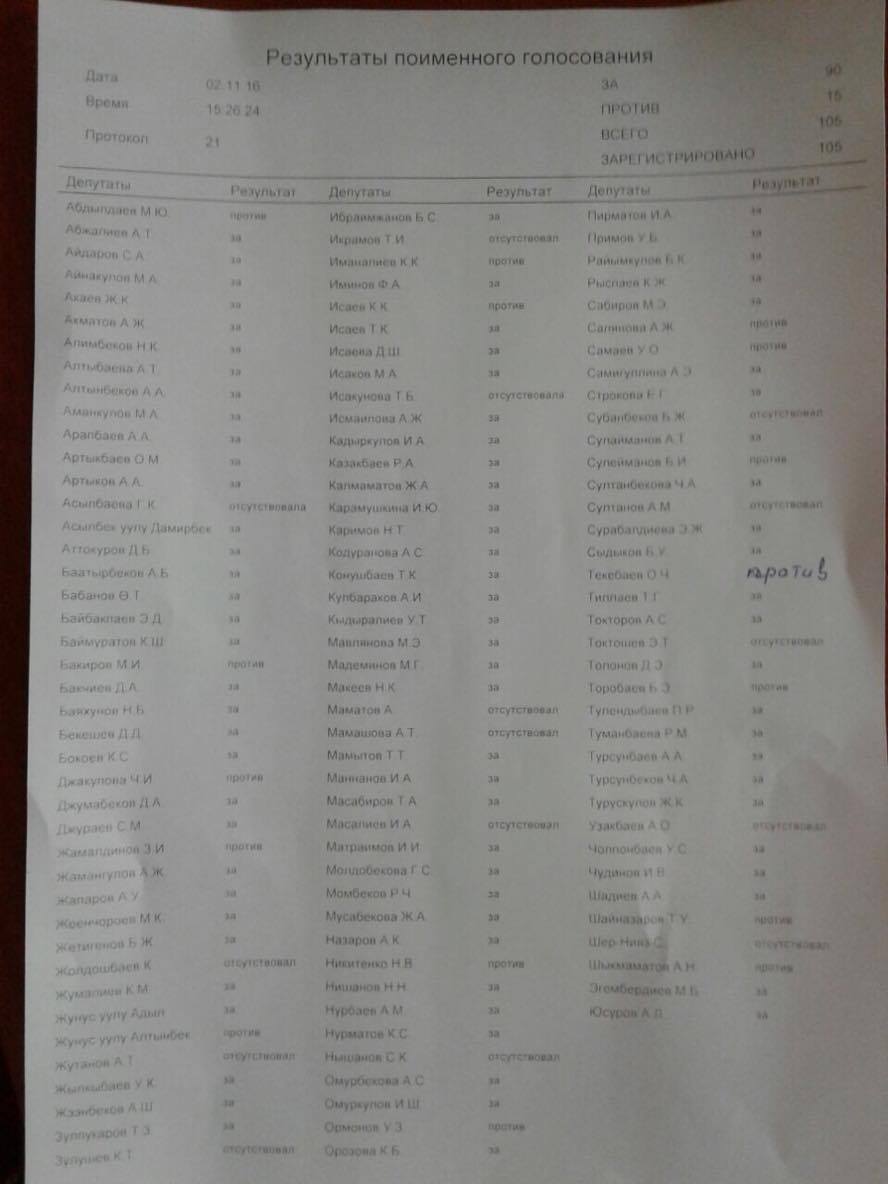 Причем по программе «за» проголосовало 90 парламентариев, но депутат Омурбек Текебаев заявил, что ошибся и случайно нажал кнопку. «Прошу вас, поставьте на переголосование, это ведь останется в истории», - попросил он спикера.