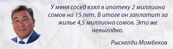 «Проценты, которые люди платят - учителя и врачи, идут на вашу зарплату. Ваш председатель $2-3 тысячи получает, я знаю. Нужно пересмотреть условия программы «Доступное жилье». Если проценты по кредиту снизим до 4-5, то ничего странного не произойдет», - негодовал Рыскелди Момбеков.