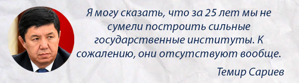 «Мы каждый раз меняли правила. Менялись принципы формирования институтов. Менялись полномочия госорганов. Мы не сумели наладить традиции органов управления. Мы не сумели привить культуру власти. Мы до сих пор в поиске. Каждый, кто приходит, пытается менять Конституцию, становятся инициаторами изменения тех или иных процессов», - подчеркнул Темир Сариев.