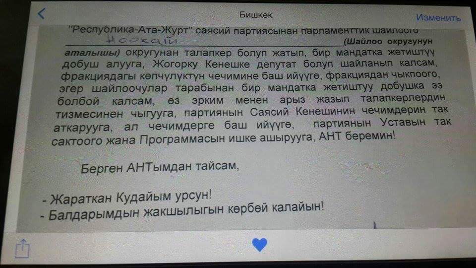 «Мы вынуждены брать с наших кандидатов клятву, чтобы усилить дисциплину в партии», - заявил журналистам сопредседатель политической организации Омурбек Бабанов.