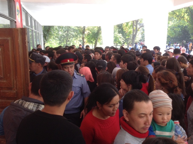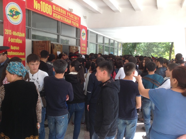 По словам председателя данного избирательного участка Урмата Аманалиева, очередь образовалась в связи с выходом из строя оборудования по идентификации граждан.