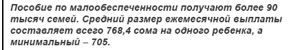 Чтобы как-то бороться с иждивенческими настроениями, Министерство труда и социального развития запустило в сентябре 2016 года проект – так называемый социальный контракт. Малообеспеченные семьи смогут единовременно получить пособие за весь год (до 48 тысяч сомов)… на развитие бизнеса. В ведомстве уверены, что проект поможет стимулировать малообеспеченные семьи к поиску выхода из трудной жизненной ситуации, решить проблему иждивенческих настроений и повысить экономическую активность населения.