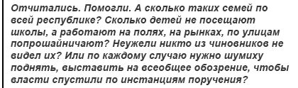 Как правило, чем беднее человек, чем ниже уровень его образования, тем больше у него детей. Пользователи соцсетей задаются справедливым вопросом: зачем заводить детей, если не можешь их достойно обеспечить? «В первую очередь виноваты нерадивые родители! Не надо во всем винить государство. Бомжи и нищие есть и в более сытых странах. Перед тем как заводить детей, надо морально и материально подготовиться, - правильно замечают они. - Ребенок не собака, которую можно выгнать на улицу в трудную минуту. Легко сваливать вину на государство, чиновников, президента… В первую очередь каждый должен нести ответственность за свою семью сам».