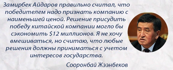 Нашли подтверждение и факты того, что Замирбек Айдаров давил на конкурсную комиссию, чтобы она признала победителем претендента с наименьшей ценой - китайскую компанию China Railway №5. Она предложила реконструировать дорогу за рекордно низкие $70 миллионов при оценочной стоимости проекта в $100 миллионов. Ближайший претендент предложил на $12 миллионов больше.