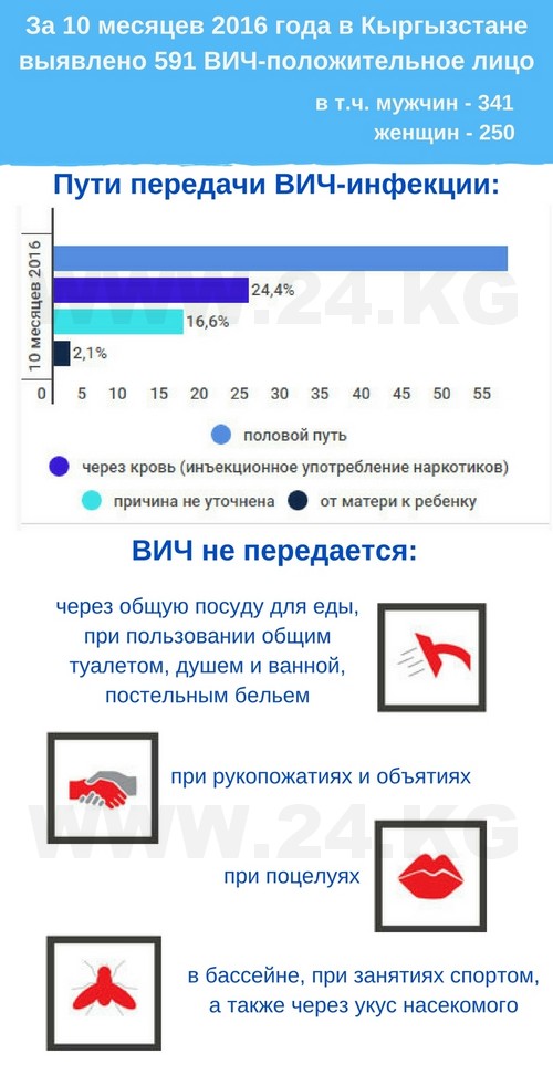 По данным Минздрава, на 1 ноября 2016 года в Кыргызстане официально зарегистрировано 6 тысяч 983 ВИЧ-инфицированных граждан, в том числе более 500 детей.