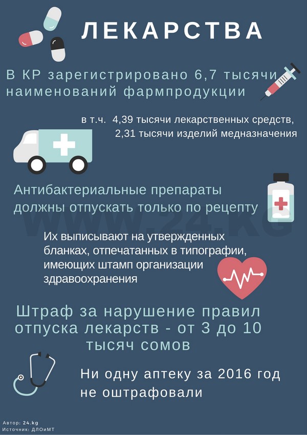 - Перечень лекарств, отпускаемых по рецепту (в том числе антибиотики), утвержден приказом Минздрава КР №353 от 23.06.2014 года. Документ размещен на официальном сайте Департамента лекарственного обеспечения и медтехники (ДЛОиМТ).