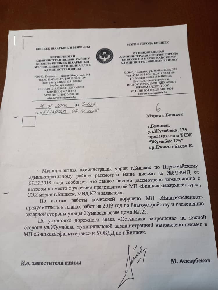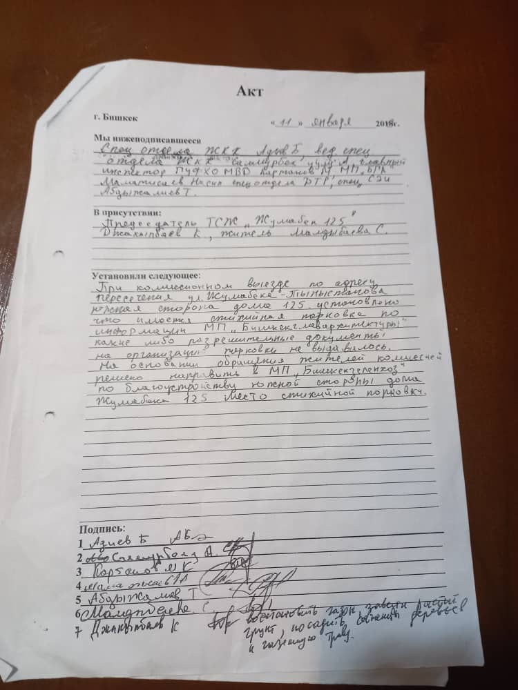 По его словам, еще в 2019 году комиссия мэрии Бишкека вынесла акт о незаконности парковки и обязала Бишкекзеленхоз восстановить газоны, посадить деревья и живую изгородь.