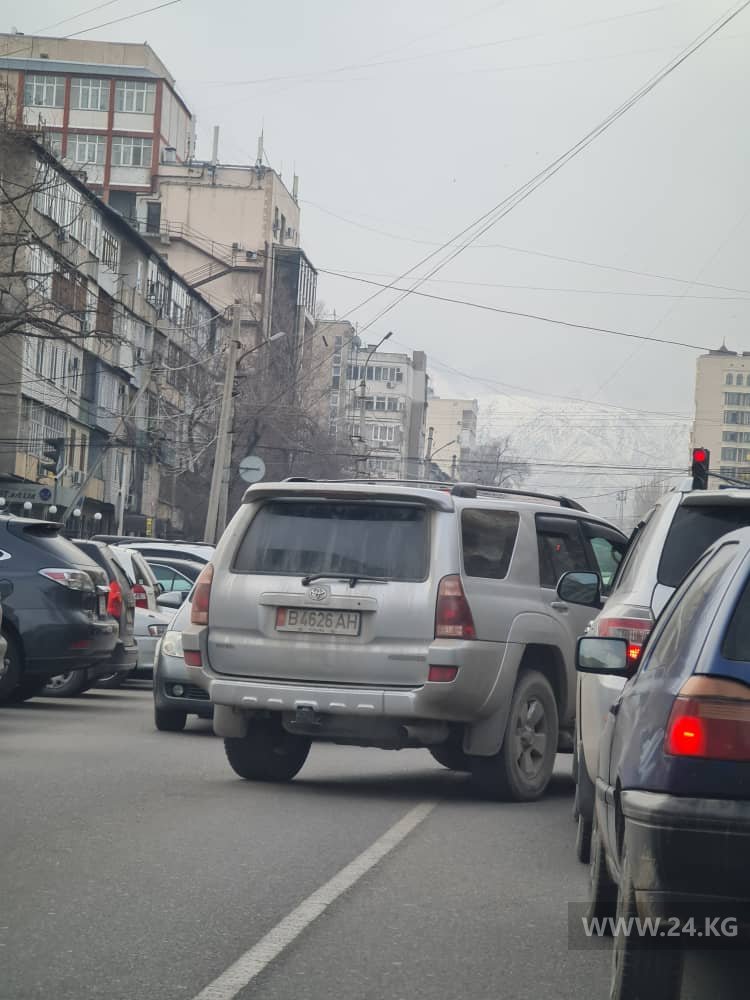 На улице Тыныстанова, не доезжая до Токтогула, водитель поехал по встречке. «Устроил затор встречному направлению. Все стояли, он один решил объехать», — написал автор снимков.