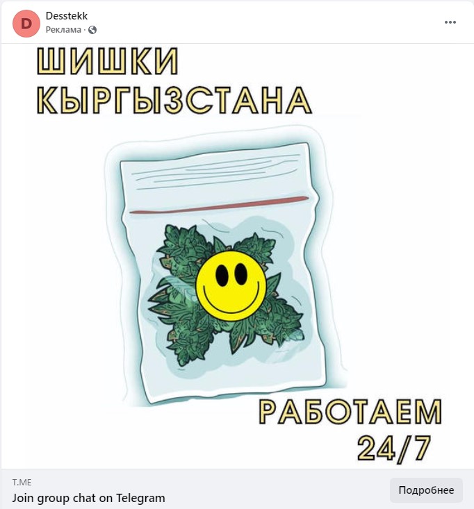 Читатель 24.kg возмущен открытой рекламой наркотиков в интернете. Бишкекчанин прислал скриншоты, сделанные им в Facebook и Telegram.