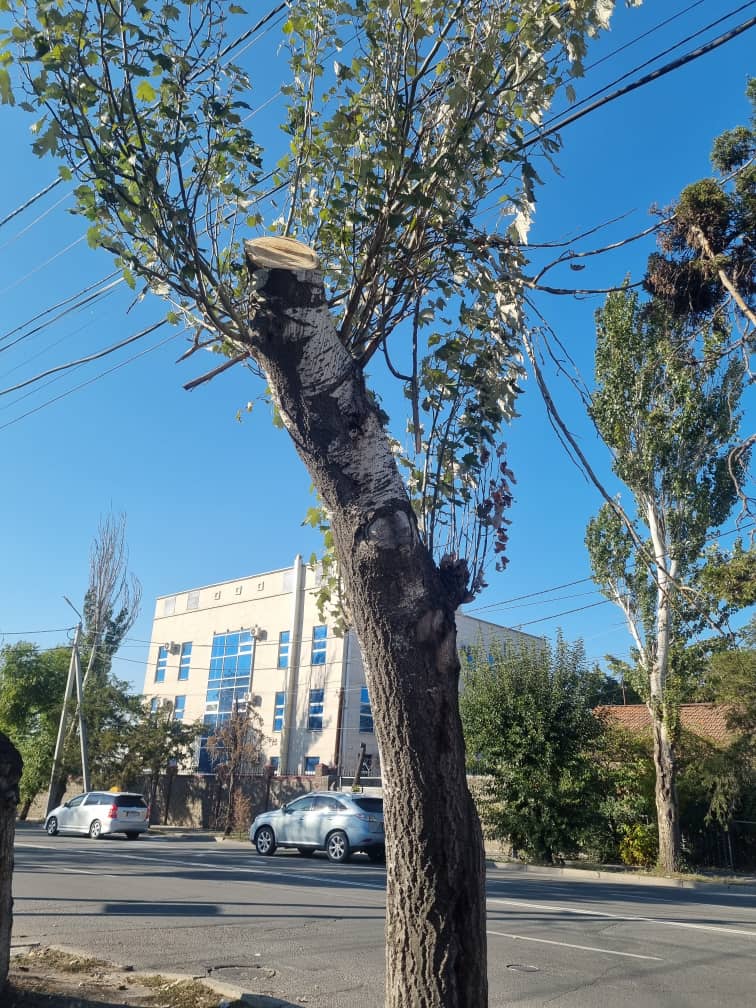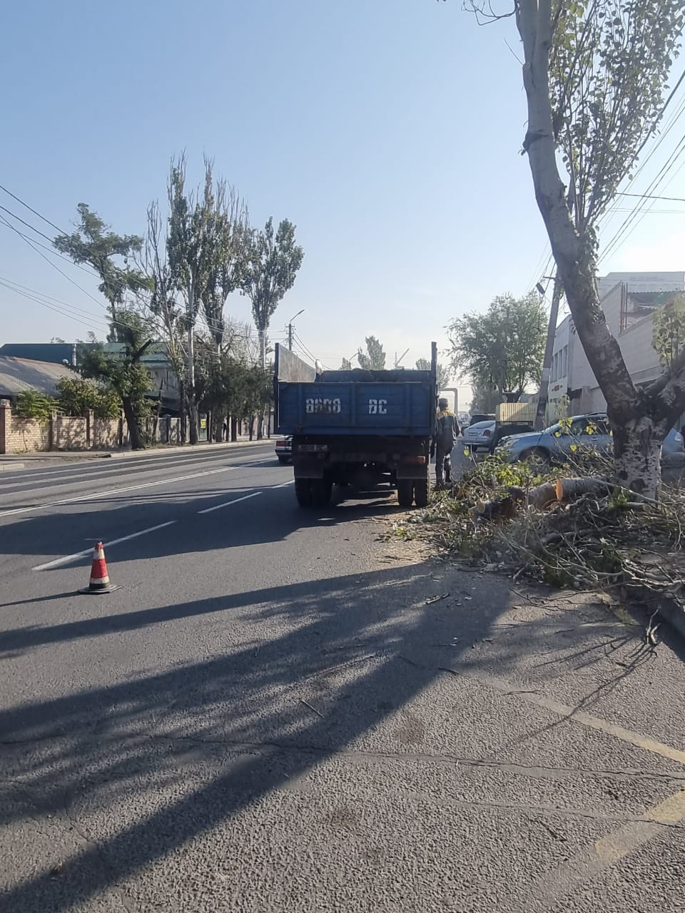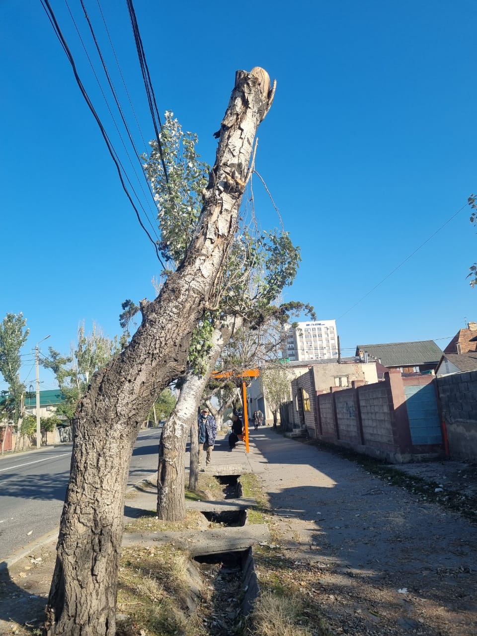 В Бишкеке на улице Ахунбаева на пересечении с переулком Терским варварски обрезают деревья. Об этом 24.kg сообщил читатель.