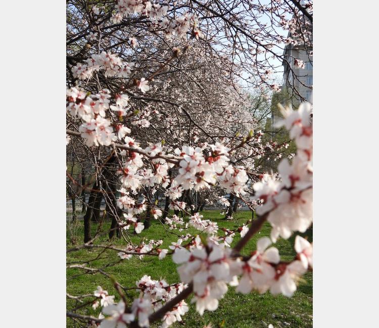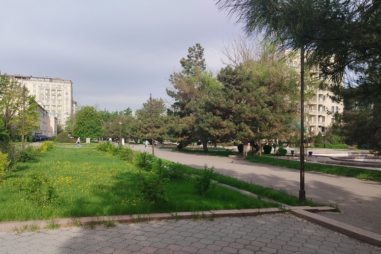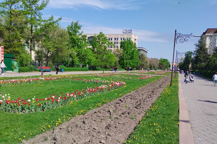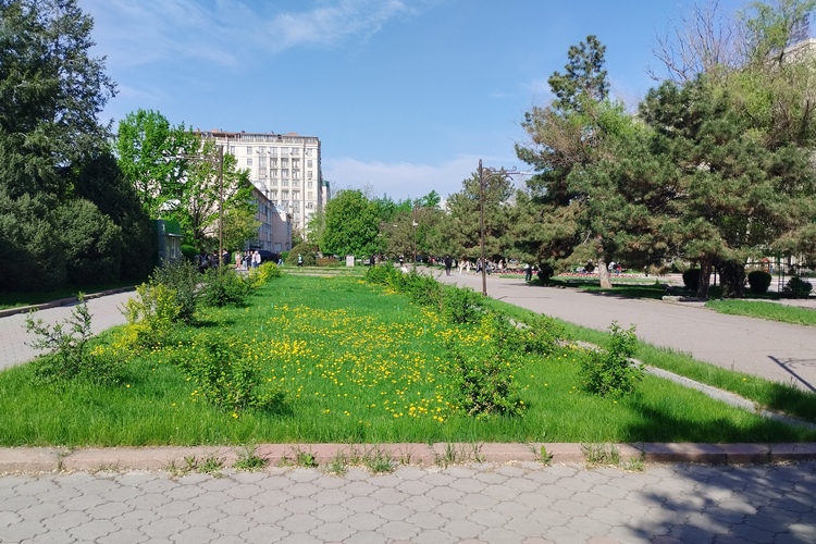 Пройдемся еще немного по апрельскому Бишкеку. Газоны уже захватили одуванчики и тюльпаны.