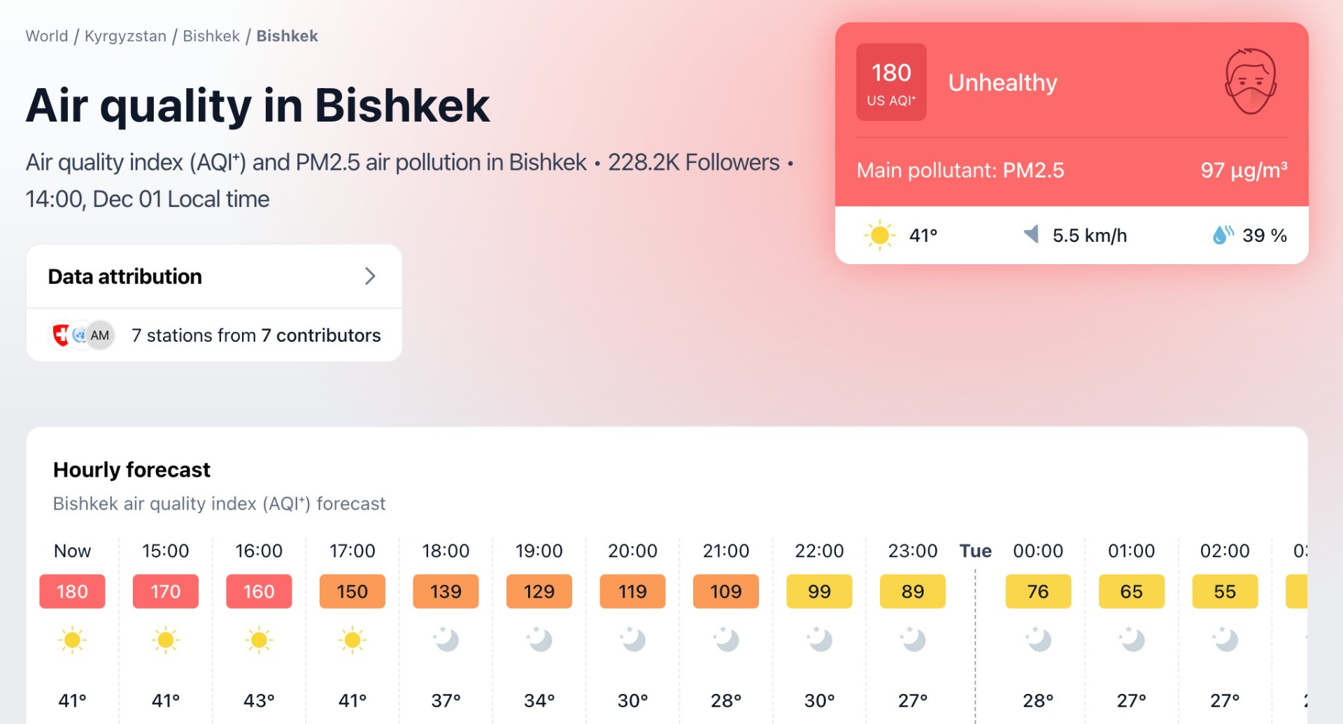 По данным IQAir, на 14.00 1 декабря в городе индекс качества воздуха (AQI) составляет 180 — «нездоровый». Главный загрязнитель — мелкие частицы PM2.5, концентрация которых значительно превышает нормы.